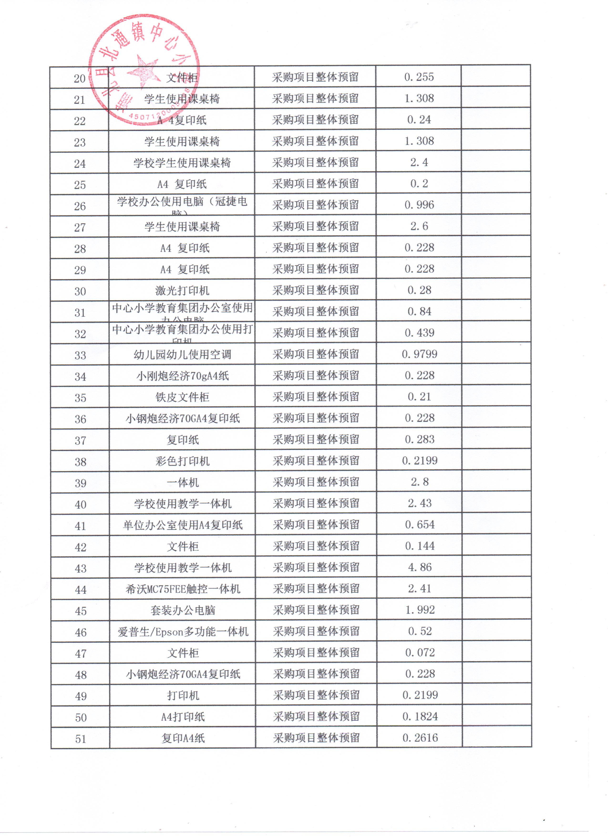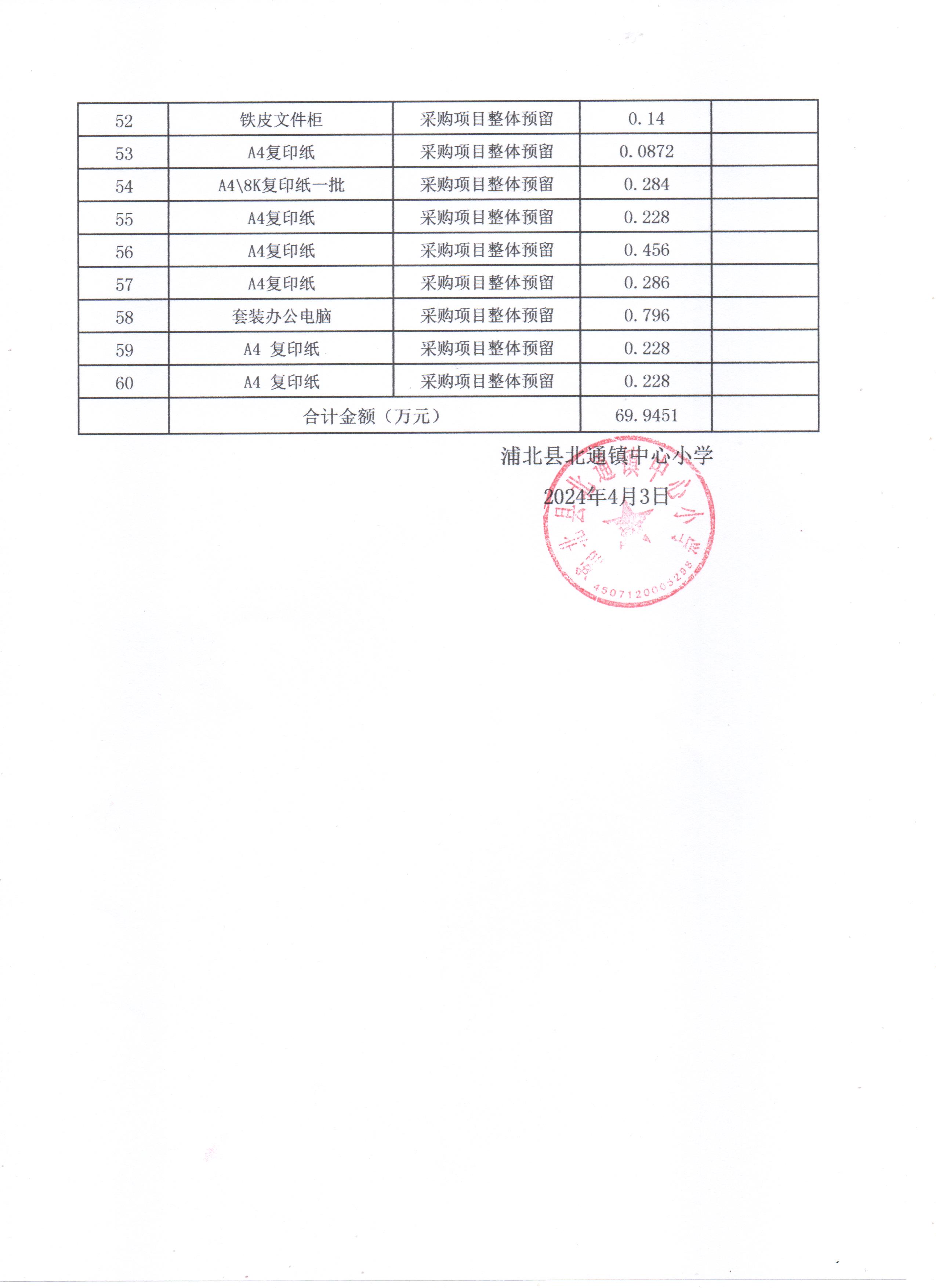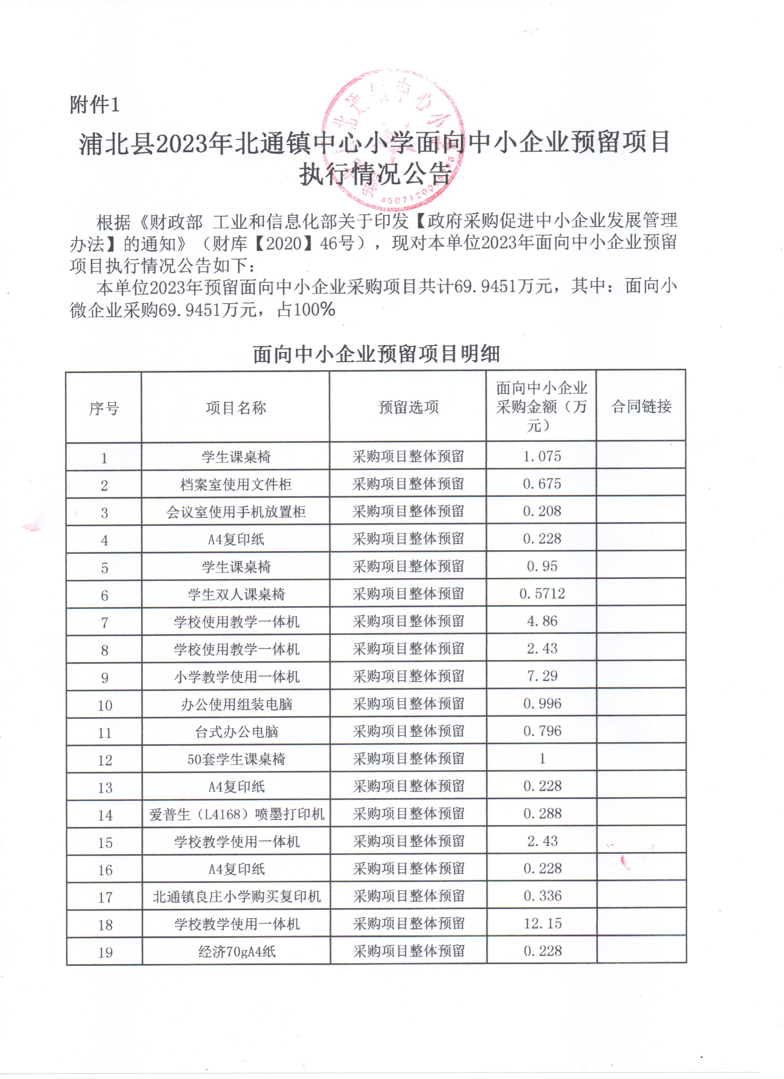 | 1 | 北通镇中心小学2023年面向中小企业预留项目执行情况公告 | 采购项目整体预留(预留中小企业的比例:100.00%) | 69.94 | - |