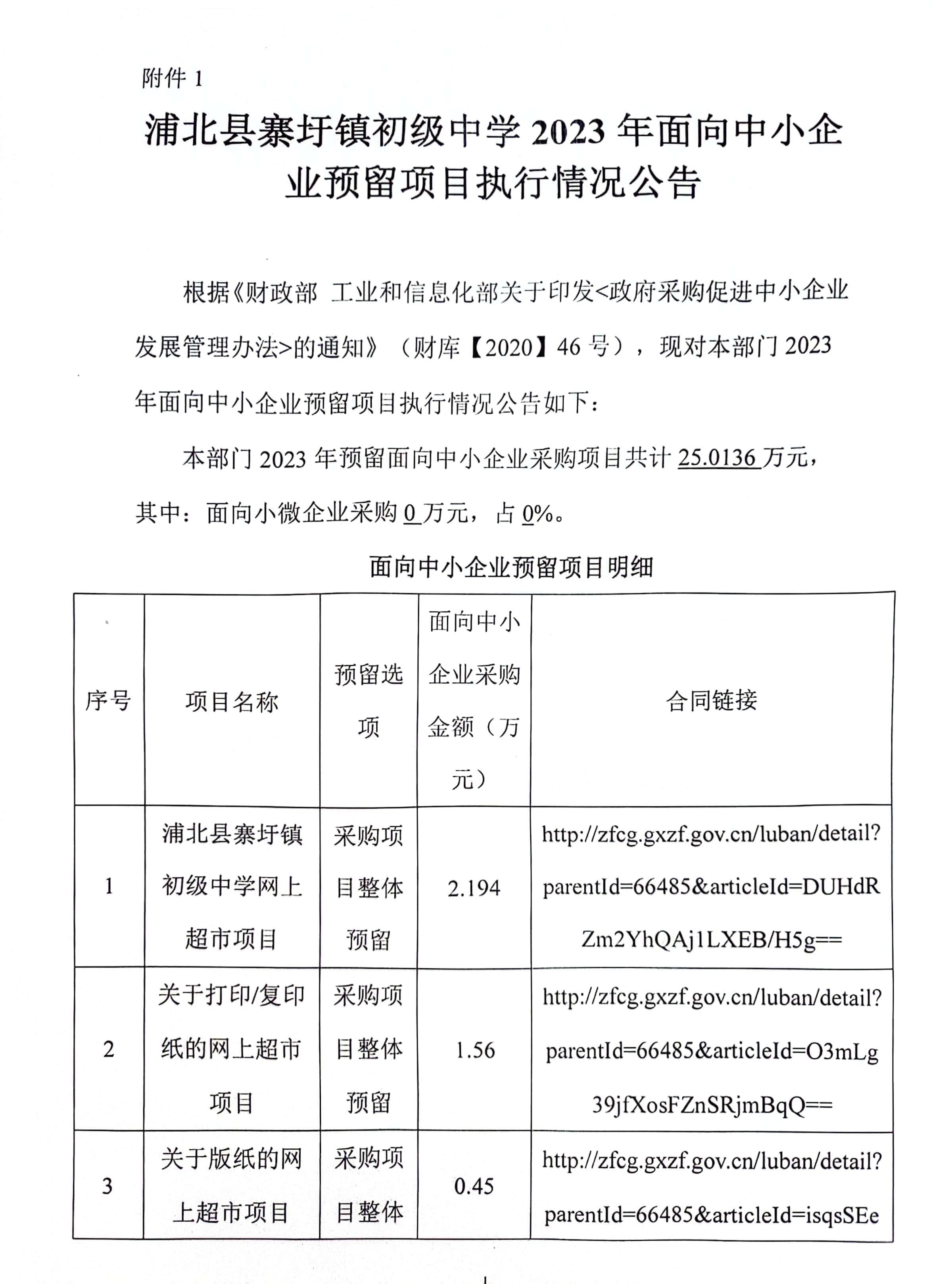 根据《政府采购促进中小企业发展管理办法》(财库﹝2020﹞46号)要求,现对本部门(单位)2023年面向中小企业预留项目执行情况公告如下: