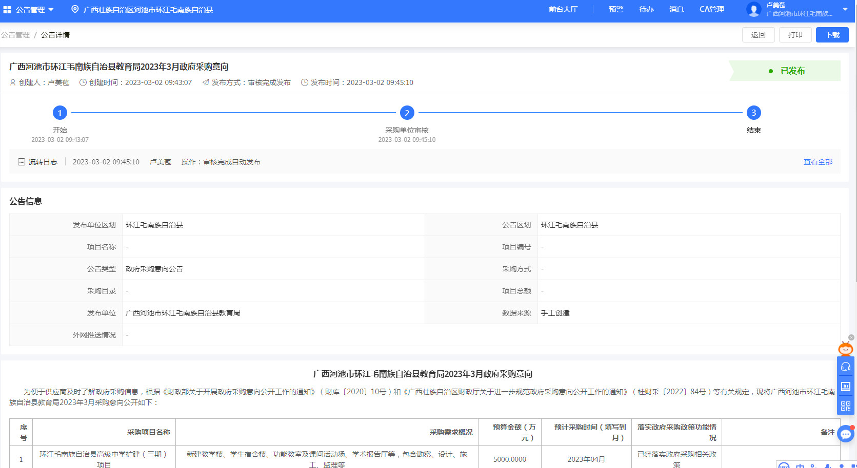 环江毛南族自治县高级中学扩建(三期)项目,于2023年3月2日意向公告,现如今,该项目名称和项目投资金额都有了很大的变化,需要撤销原意向公告,重新进行意向公告,特此公告。