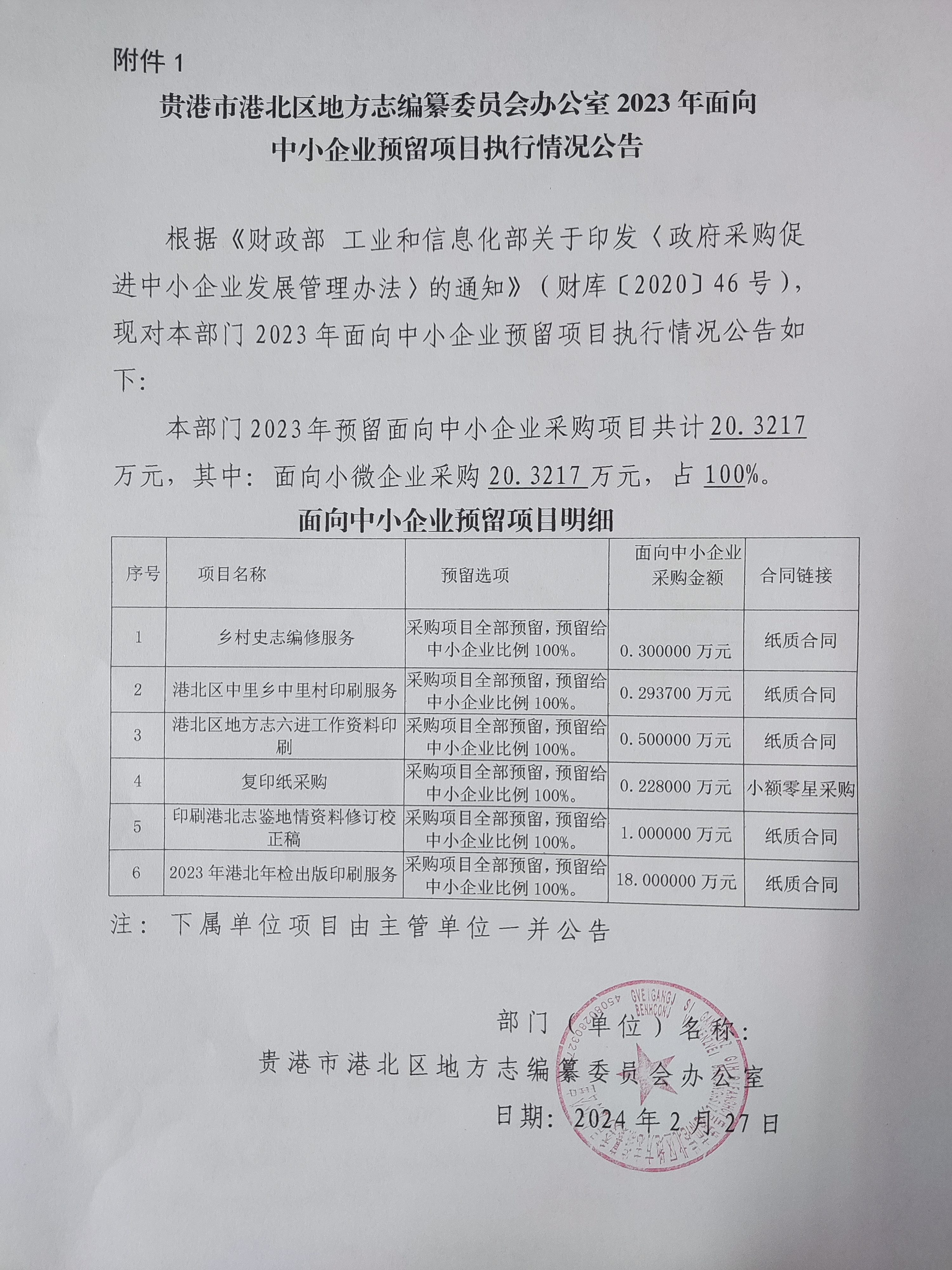 | 1 | 贵港市港北区地方志编纂委员会办公室2023年面向中小企业预留项目执行情况公告 | 采购项目整体预留(预留中小企业的比例:100.00%) | 20.32 | - |