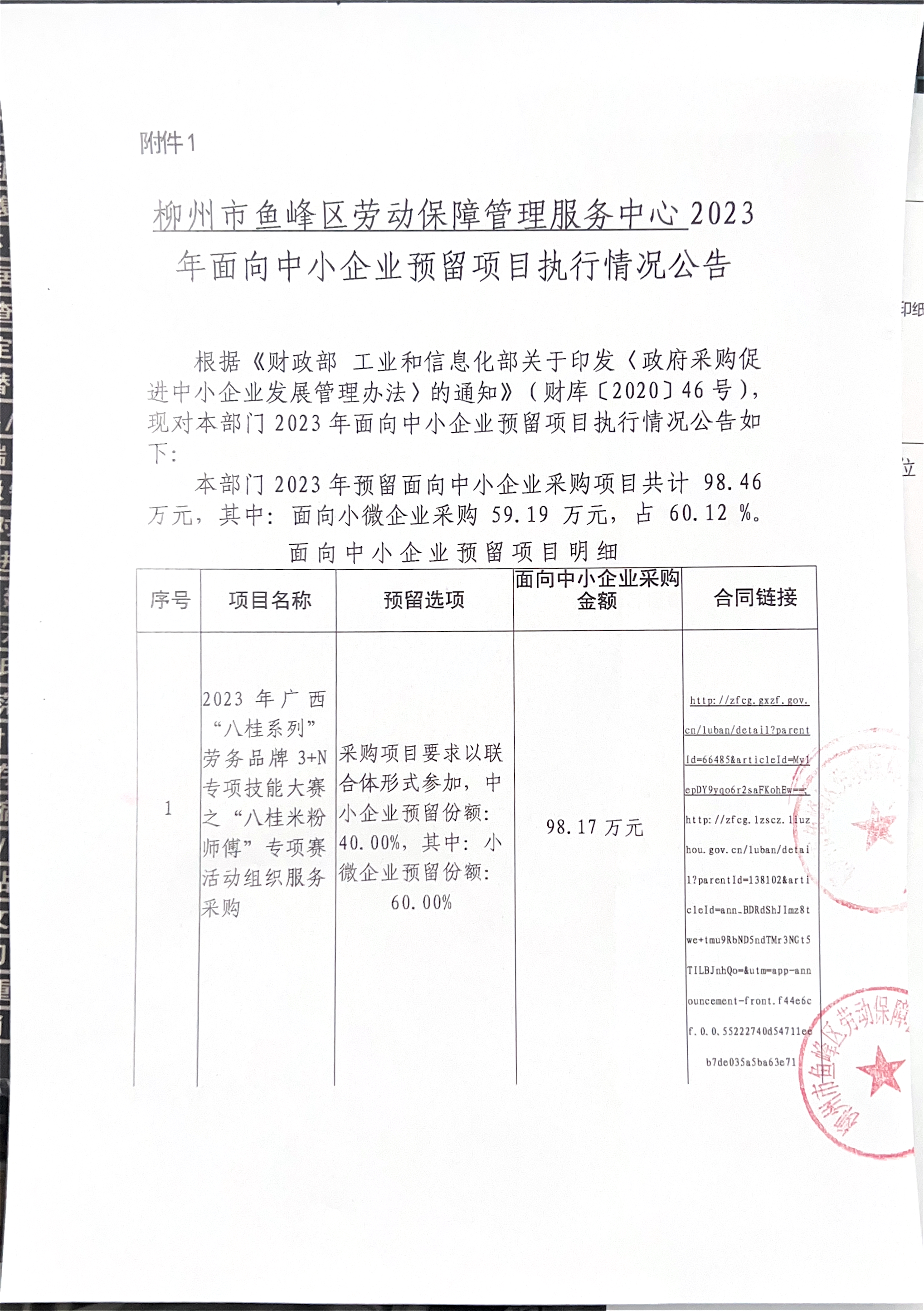 | 1 | 2023年广西“八桂系列”劳务品牌3+N专项技能大赛之“八桂米粉师傅”专项赛活动组织服务采购 | 要求以联合体形式参加(预留中小企业的比例:40.00%) | 98.17 | 合同名称:2023年广西“八桂系列”劳务品牌3+N专项技能大赛之“八桂米粉师傅”专项赛活动组织服务采购合同编号:11N98622025E20231 |