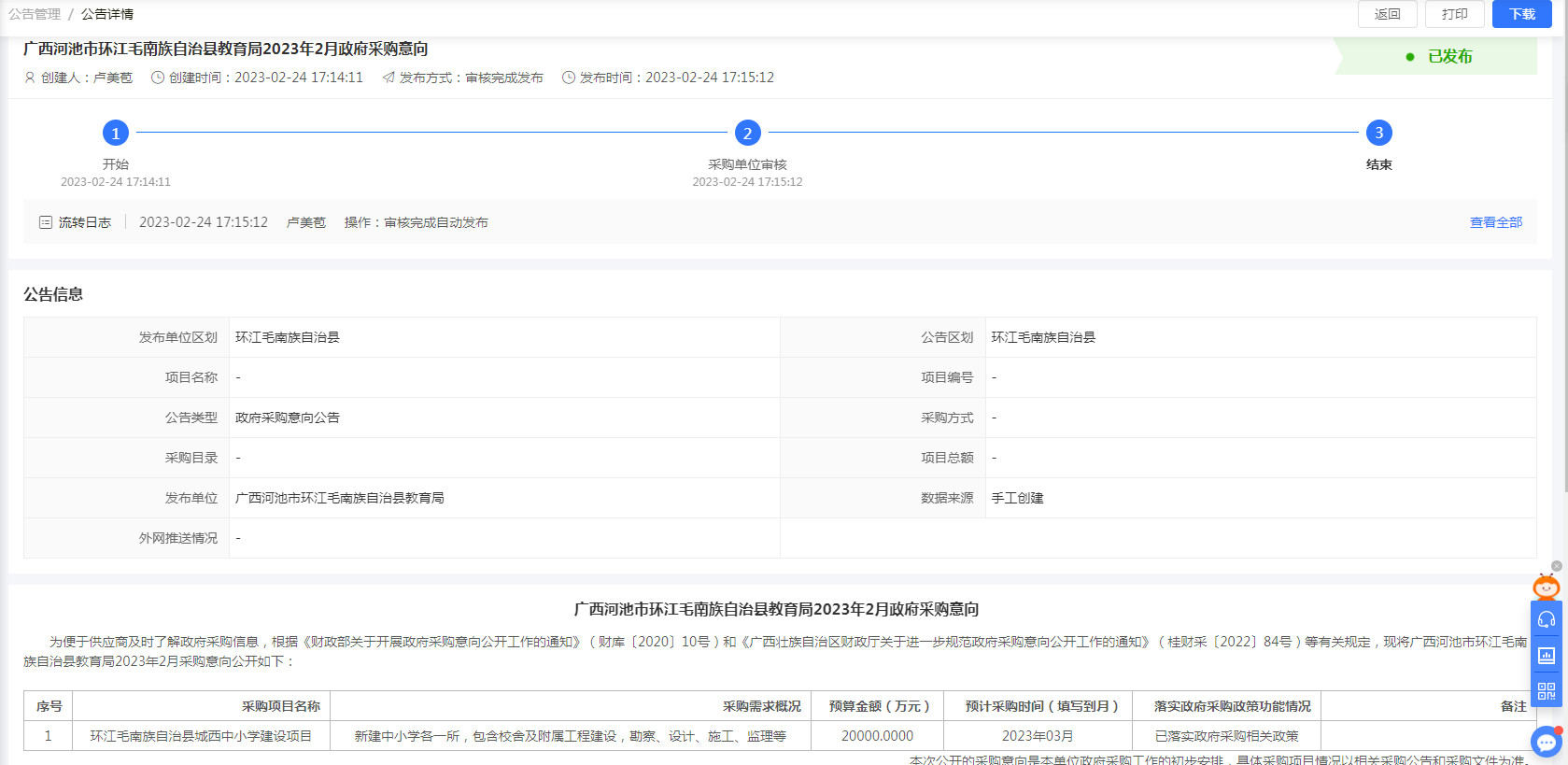 环江毛南族自治县城西中小学建设项目,于2023年2月24日意向公告,现如今,该项目名称和项目投资金额都有了很大的变化,需要撤销原意向公告,重新进行意向公告,特此公告